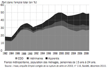 AccueilExpressions par MontaigneLes jeunes et les peu diplômés, premières victimes des contrats courtsLa plateforme de débats et d’actualités de l’Institut Montaigne Régulation Éducation07/12/2011ImprimerPARTAGERLes jeunes et les peu diplômés, premières victimes des contrats courtsAuteur Institut Montaigne La part des "formes particulières de l’emploi" (CDD et contrats saisonniers, intérim, stages et contrats aidés, apprentissage) était en 2009 de 50 % parmi les 15-24 ans contre 13 % des actifs sur l’ensemble de la population (1). Hors contrats en alternance, le nombre de jeunes âgés entre 15 et 29 ans employés en CDD et emplois aidés dans le secteur privé ou dans des entreprises publiques s’élève à 25% et à 5% pour les contrats en intérim contre respectivement 10% et 2% pour l’ensemble des actifs (2).Développement des "formes particulières d'emploi" tous âges confondusLa part des "formes particulières d’emploi" (CDD, contrats saisonniers, intérim, stages et contrats aidés, apprentissage) a doublé en 15 ans, passant de 1982 à 2009 de 5 % à 11 % de l'emploi total.Développement des "formes particulières d'emploi" chez les jeunes de 15 à 24 ansChez les jeunes, la part des "formes particulières d'emploi" a augmenté tout au long des années 1980 et 1990 avant de se généraliser puisqu'elles représentent, en 2009, près de la moitié des emplois, contre près d'un sur cinq en 1982.Dans son étude Un CDI pour tous , l’Institut Montaigne propose de supprimer le CDD et de généraliser le CDI en envisageant très précisément les modalités juridiques d’une telle décision.- Pourquoi proposer un CDI pour tous ? Qu’y gagnent les employeurs ? Qu’y gagnent les employé(e)s ? Les réponses de Céline Gleize, auteur de l’étude Un CDI pour tous. - 15 propositions pour l’emploi des jeunes et des seniors, Rapport, septembre 2010(1) Insee, Marché du travail, séries longues, n° 116, décembre 2010. (2) DARES, Emploi et chômage des 15-29 ans en 2009, octobre 2010, n°072.ImprimerPARTAGER