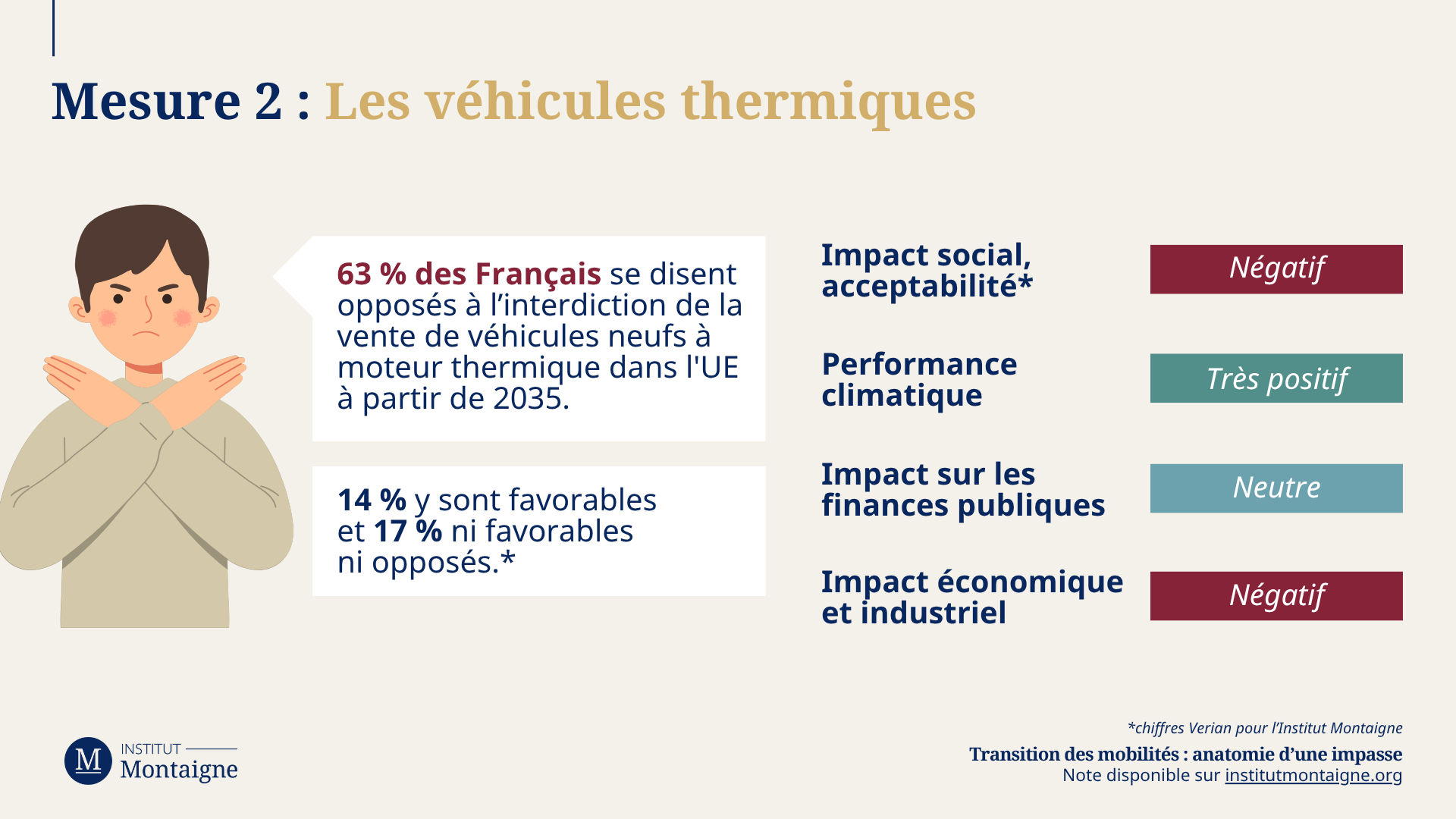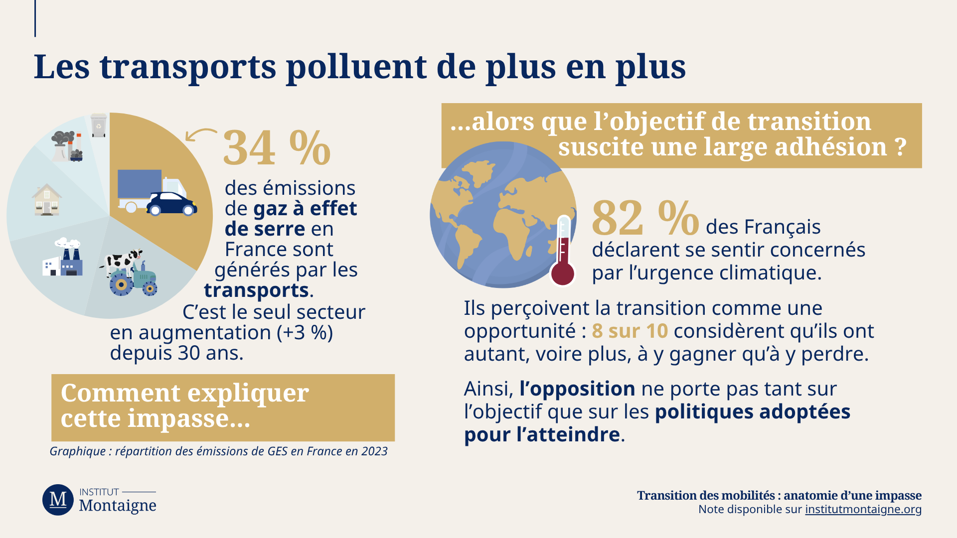 AccueilVilles et territoiresTransition des mobilités : anatomie d’une impasseNote d'éclairage Octobre 2025Transition des mobilités : anatomie d’une impasse Villes et territoires Environnement Action publiquePARTAGERAuteurs Hugues Bernard Ancien chargé de projets - Climat et environnement Hugues Bernard était chargé d’études sur les questions énergétiques et environnementales à l'Institut Montaigne de 2022 à 2025. Louis de Crevoisier Haut fonctionnaire au ministère de l’Économie et des finances Louis de Crevoisier est haut fonctionnaire au ministère de l’Économie et des finances. Il était auparavant directeur adjoint de cabinet du ministre des Transports. Nicolas Laine Responsable des Publications - Études France Nicolas Laine est Responsable de projets, Publications aux études France. Il s’intéresse particulièrement aux questions économiques, à l’efficacité de l’État, ainsi qu’aux enjeux environnementaux et territoriaux. Télécharger Note (120 pages) Résumé (4 pages)